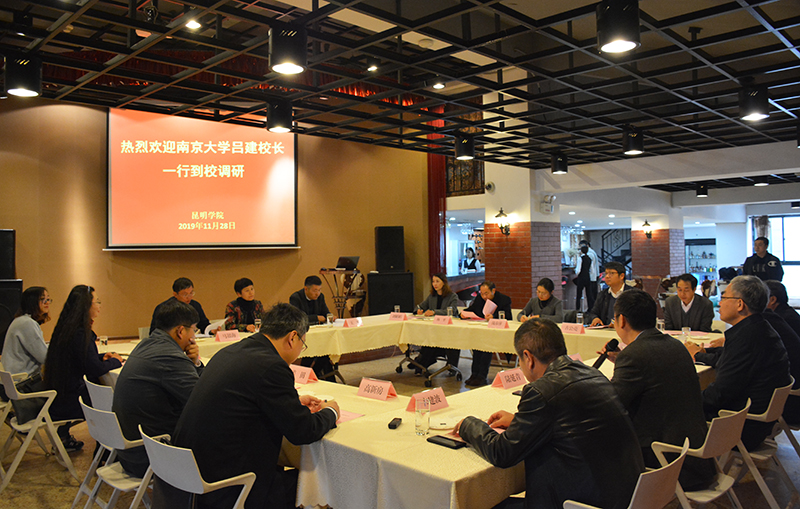 11月28日,南京大学校长吕建、副校长陆延青一行11人到校调研指导教育帮扶、科研合作等工作。beat365亚洲版官网校长黎素梅,副校长马银海、王凡与来宾在旅游学院酒水实验室进行座谈交流,王凡副校长主持座谈会。