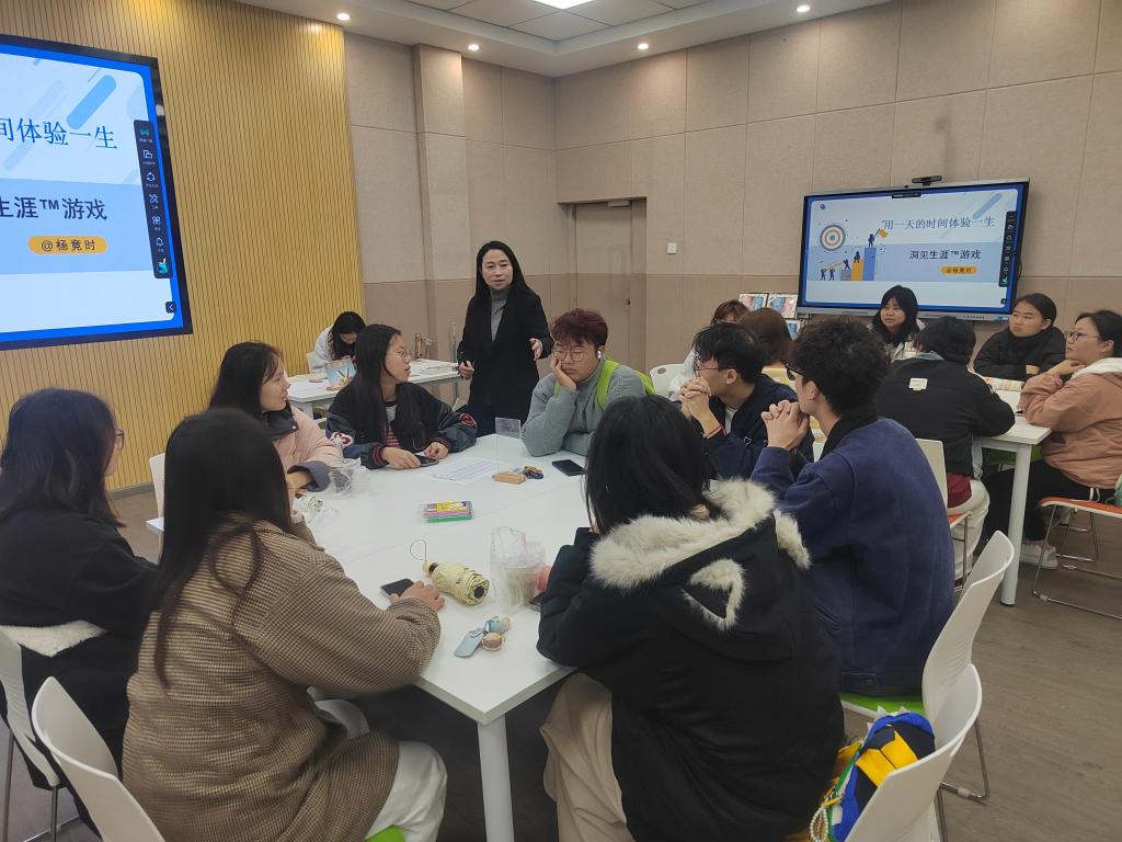 活动伊始,讲师为参与学生阐释了本次洞见生涯职场体验课的宗旨,并详细讲解了规则。本次课程模拟了各小组35年职业生涯,通过人生不同阶段的职业场景,让学生体验真实的生涯发展经历。参与者们在游戏中面临各种选择,感受经济形势变化带给每个人的影响。活动过程中,讲师复盘提问,各小组成员踊跃回答,现场互动气氛热烈。课程结束后,各小组进行总结与反思,。同学们纷纷表示自己深切领悟到职场的道理和职业生涯的重要意义。