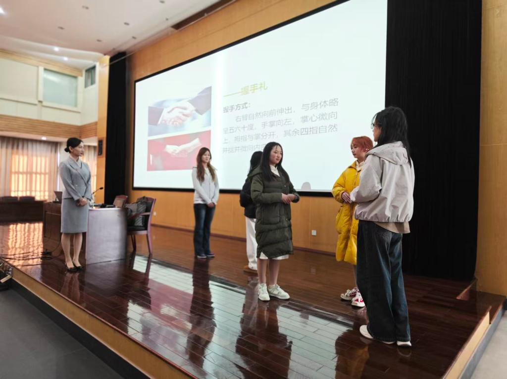 在实操环节,崔谨老师针对站姿、坐姿、走姿等形体礼仪,以及握手、介绍等社交礼仪进行了现场示范,邀请师生上台互动,通过情景模拟的方式,让大家掌握不同职场场景下的礼仪技巧。现场气氛热烈,师生们积极参与、认真练习,在亲身体验中深化了对礼仪知识的理解。