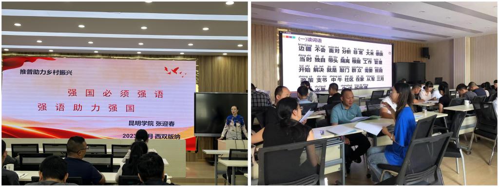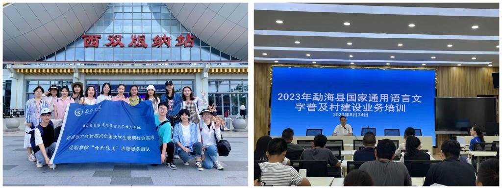 2023年8月,作为教育部“推普助力乡村振兴”全国大学生暑期社会实践志愿服务活动团队,在指导教师邓瑶教授的带领下,一行17人奔赴西双版纳勐海县,为全县30余名村干部代表开展普及村建设的专题讲座培训;走进傣族、哈尼族、布朗族等十数个少数民族村寨,开展“推普专题调研”和普及村建设微课堂;面向勐遮镇70余名幼儿教师,开展“童语同音”专题培训。