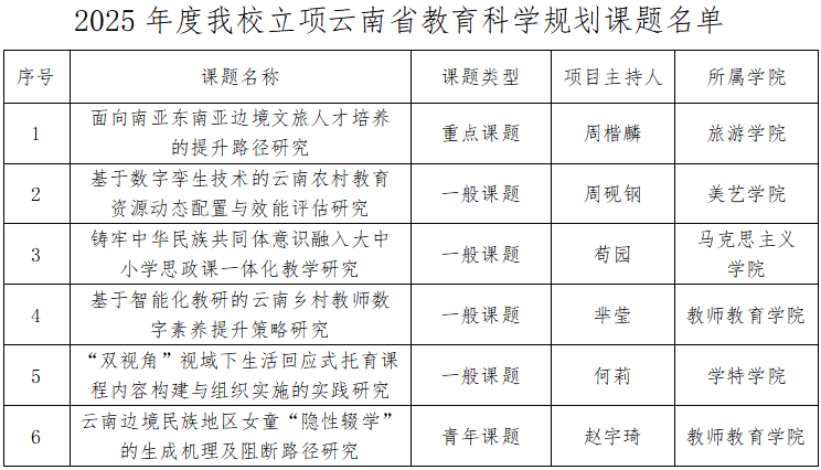 日前云南省教育厅公布《云南省教育厅关于下达2025年度云南省教育科学规划立项课题的通知》,全省立项课题278项,涵盖多个领域,聚焦教育前沿问题,旨在推动教育创新发展。我校共获得6项,其中:重点课题1项、一般课题4项、青年课题1项。