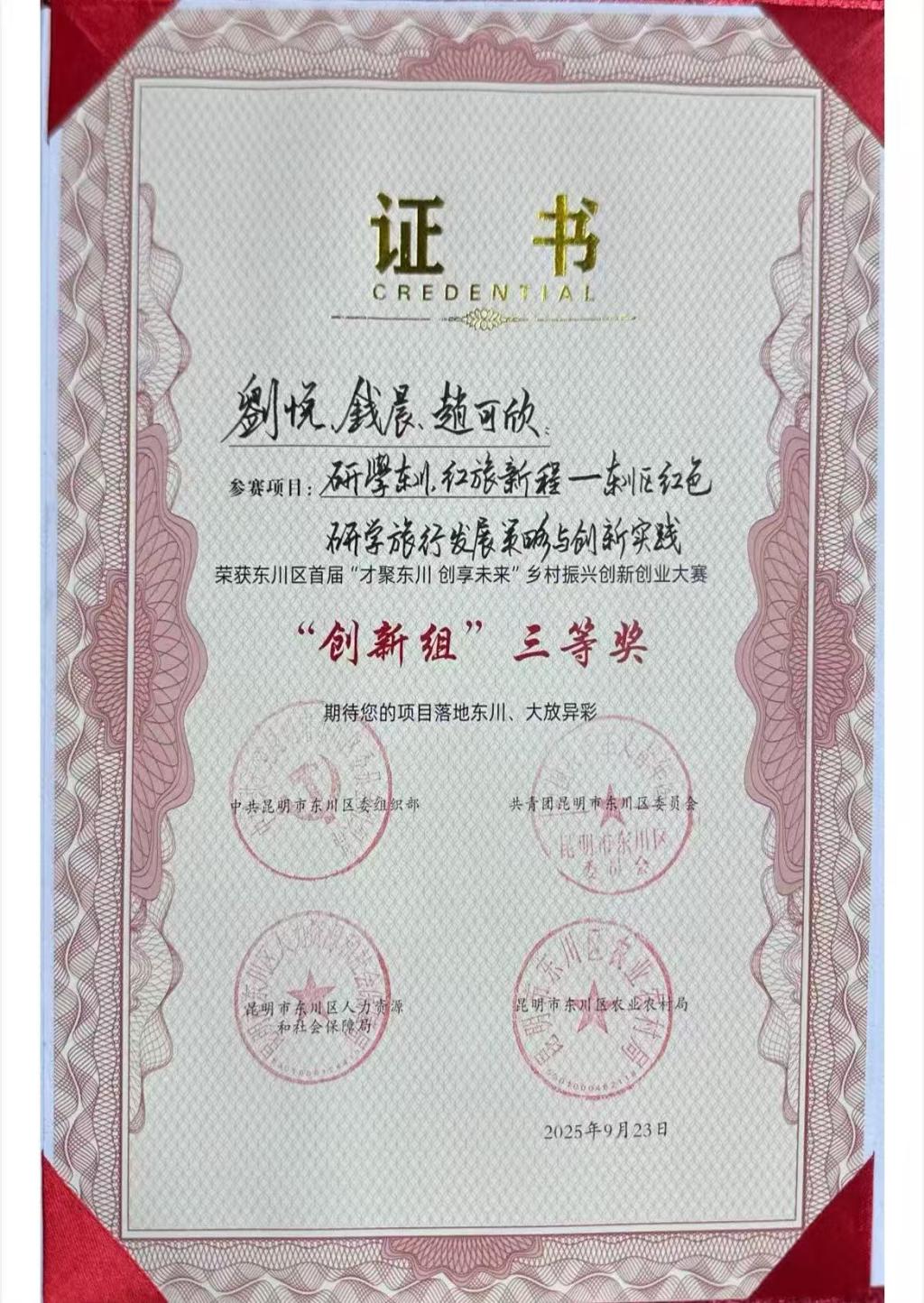 本次大赛共有500余名创新创业人员参与,169个涵盖特色农业、文旅融合、智慧乡村等领域的项目进行比拼。我校青年学子刘悦、钱晨、赵可欣团队的“研学东川,红旅新程——东川区红色研学旅行发展策略与创新实践”创新项目脱颖而出,荣获大赛创新组三等奖,并现场与云南博轩文旅签署项目落地意向协议书,享受东川区相关产业扶持政策及大赛提供的28项支持政策,初步实现了“挑战杯”大学生课外学术科技作品竞赛成果的落地转化。
