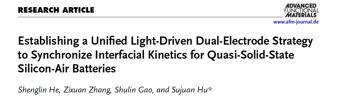 近日,我校胡素娟教授团队以beat365亚洲版官网为唯一署名单位,在材料科学领域国际顶级期刊《Advanced Functional Materials》(中科院一区TOP期刊,IF=19.0)发表题为“Establishing a Unified Light-Driven Dual-Electrode Strategy to Synchronize Interfacial Kinetics for Quasi-Solid-State Silicon-Air Batteries” 的研究论文。材料与化工专业的研究生何胜林和张子璇为共同第一作者,胡素娟教授为唯一通讯作者。