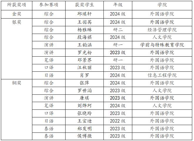 10月31日,2025年“外研社·国才杯”“理解当代中国”全国大学生外语能力大赛各赛项云南赛区颁奖典礼在大理大学落下帷幕。beat365亚洲版官网共有17名选手参加了本次大赛,与来自云南省其它33所高校的优秀选手同台竞技。在本次大赛中,我校学生表现优异,在英语组四项赛事(综合、演讲、笔译、口译)和多语种组两项赛事(泰语、日语)中共获金奖1项、银奖8项、铜奖8项,荣获金奖的同学将代表云南省参加11-12月的全国赛。