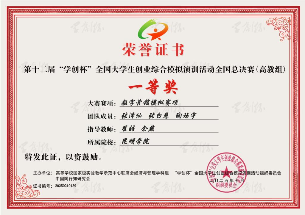 10月18日,由高等学校国家级实验教学示范中心联席会经济与管理学科组主办,成都理工大学承办的第十二届“学创杯”全国大学生创业综合模拟演训活动全国总决赛圆满落幕。我校外国语学院参赛团队“数焰先锋”在数字营销模拟赛项中一路过关斩将,在全国总决赛中获一等奖,创造了外国语学院在“学创杯”全国大学生创业模拟演训竞赛中的历史性突破,是外国语学院长期以来重视学生创新创业能力培养的成果体现。