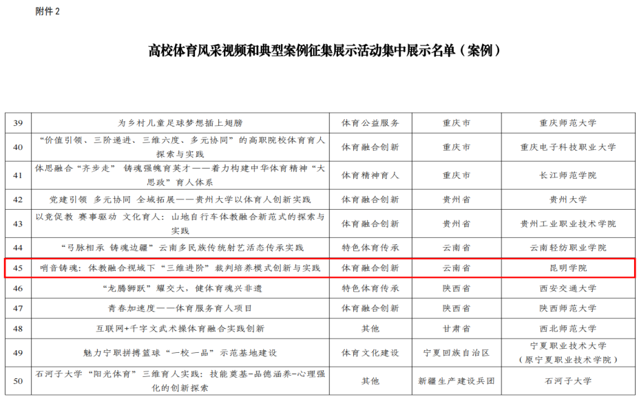 此次入选,既是对我校体育育人工作的充分肯定,也是对体育学院师生持续探索体教融合路径的积极鼓舞。值得一提的,云南省仅有两项案例入选全国展示,我校案例位列其中。该作品聚焦体教融合创新课程体系,系统呈现了我校在体育课程改革与体育精神育人方面的深入探索和阶段性成果,生动展现了昆院师生积极向上、拼搏进取的精神风貌。