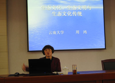 周鸿教授在介绍了文化的定义、文化和文明的生态学内涵的基础上阐释了生态文化与生态文明的含义,提出真正使一个古代文明彻底消亡的原因是支撑这个文明的自然资源的彻底破坏,用生态文化建设生态文明是保持生态健康的必然选择,最后通过图文并茂的中国典型村寨风水林解说了生态文化传统对生态保护、生态文明发展的促进作用。周鸿教授的讲座内容丰富、资料翔实、图文并茂、专业性强,为我校师生上了一堂既有严谨的学术性,又有广泛科普性的讲座。