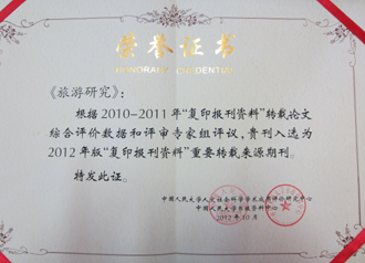中国人民大学人文社会科学学术成果评价研究中心、中国人民大学资料中心根据2010-2011年“复印报刊资料”转载论文综合评价数据和评审专家组评议,将我校主办的《旅游研究》入选为2012年版“复印报刊资料”重要转载来源期刊。